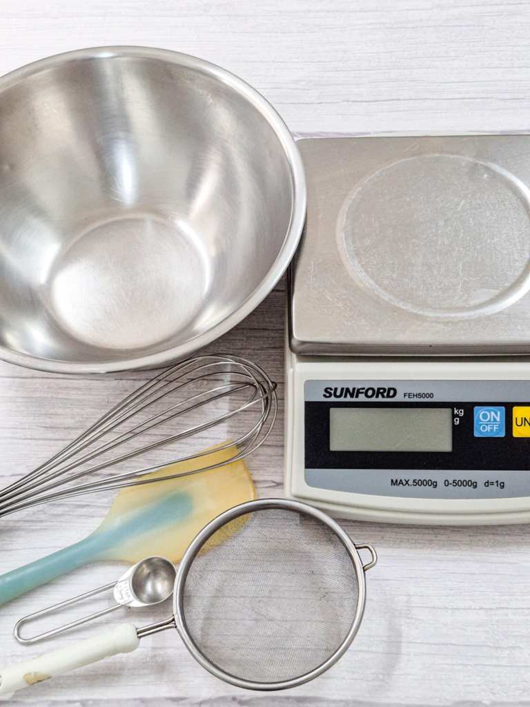 อุปกรณ์ที่ใช้ ตามนี้เลยครับ : เครื่องชั่ง, ชามผสม, ตะกร้อมือ, พายยาง, ช้อนตวง, ตะแกรงร่อนแป้ง และก็เตาอบนะครับ ขาดไม่ได้เลย