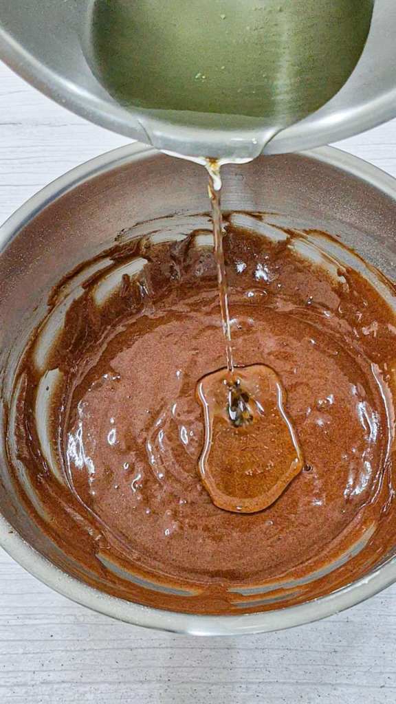 4. ใส่น้ำมันพืช แล้วคนให้ส่วนผสมเข้ากัน
