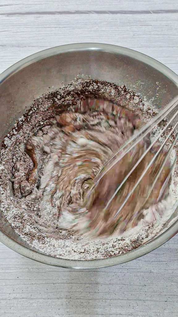 3. ร่อน แป้ง, ผงฟู, ผงโกโก้ และเกลือ แล้วคนให้ส่วนผสมเข้ากัน